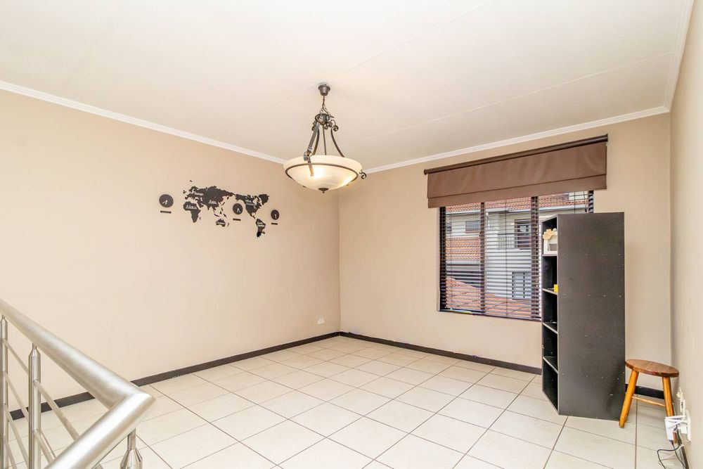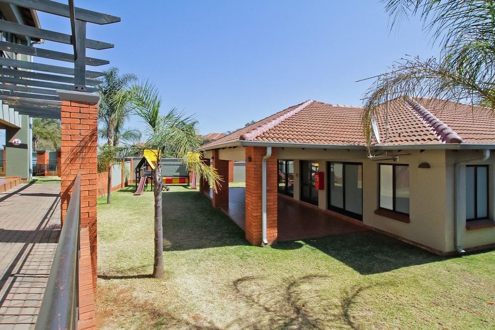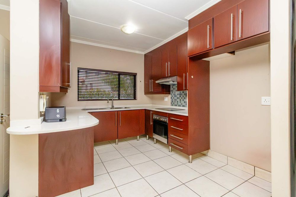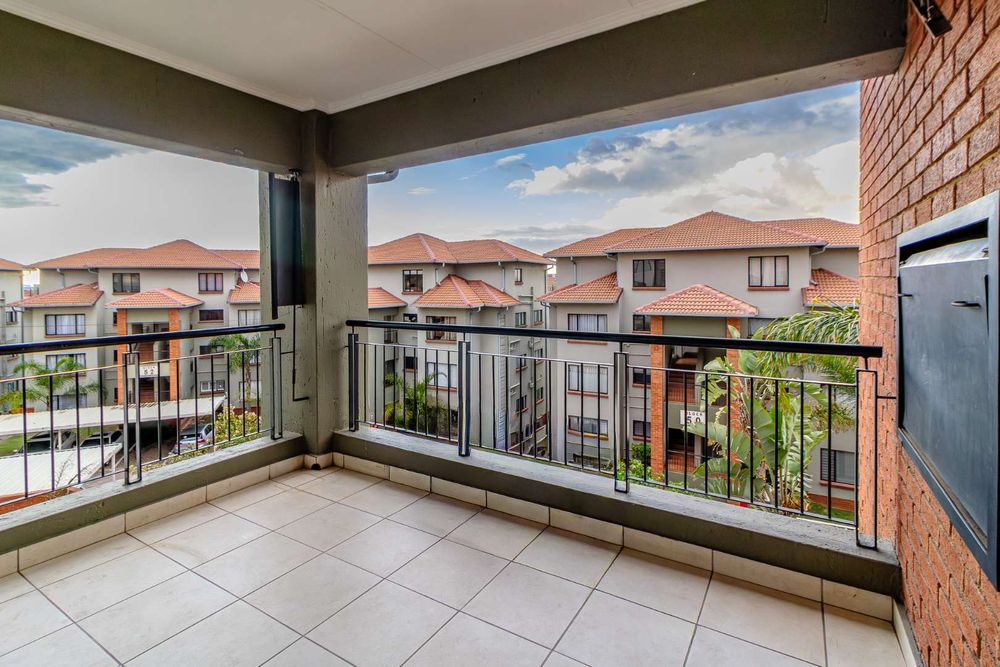 The kitchen accommodates two appliances with sufficient cupboard space, seamlessly flowing into a spacious lounge that opens onto a covered balcony with built-in braai — perfect for relaxed indoor-outdoor living.