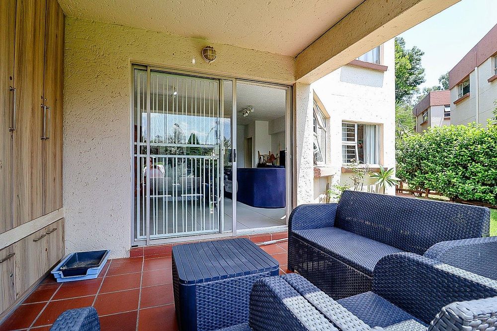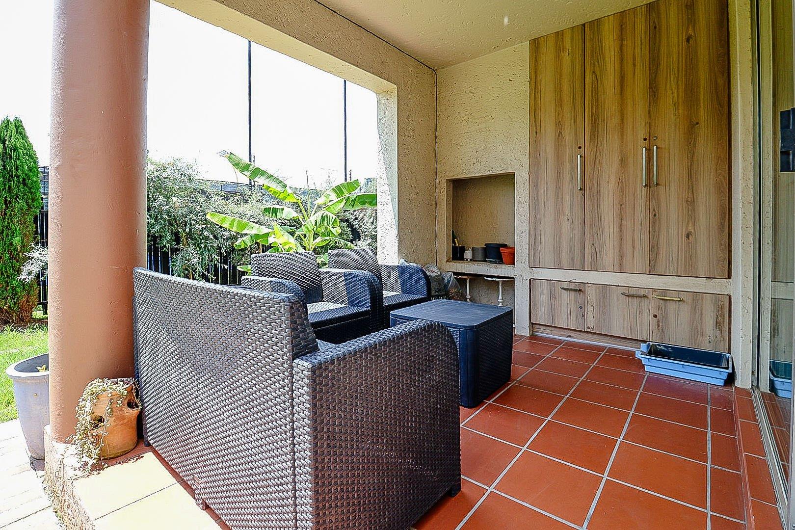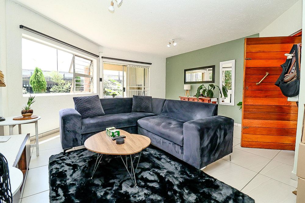 The spacious lounge leads onto a covered patio, which overlooks a lush garden—perfect for relaxing and enjoying the outdoors.