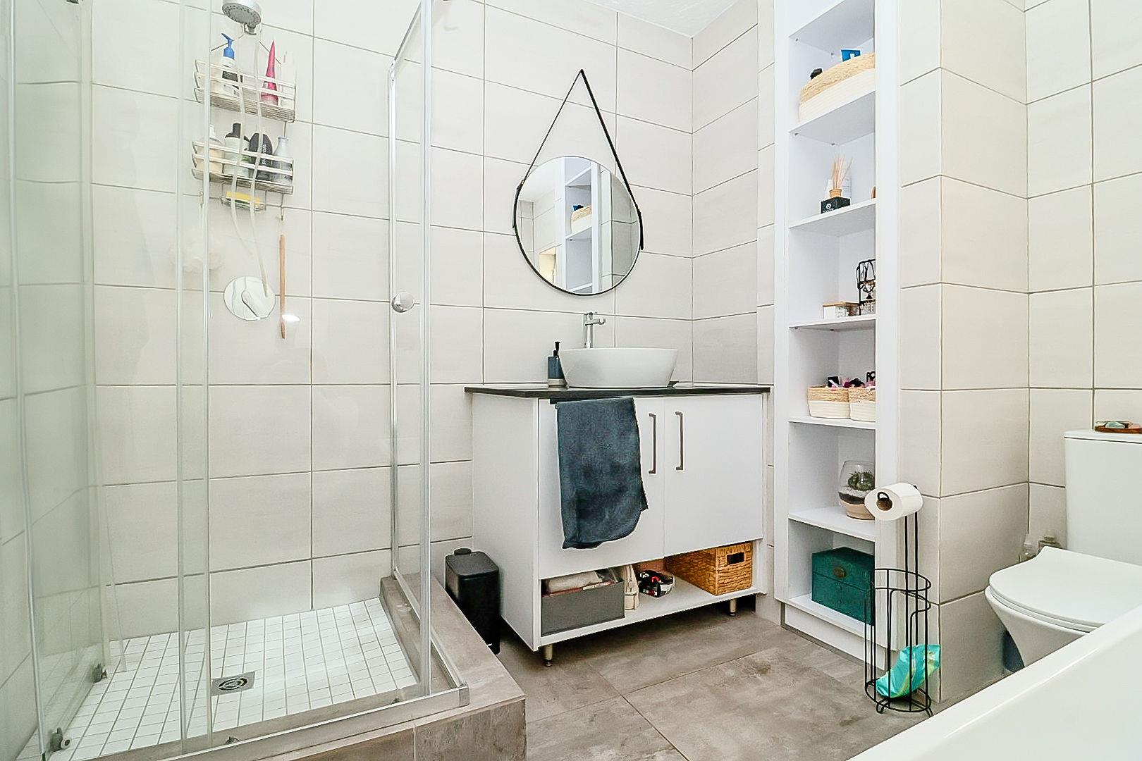 The modern kitchen accommodates one appliance, offering convenience and style, while the stunning bathroom is a true highlight of the home.