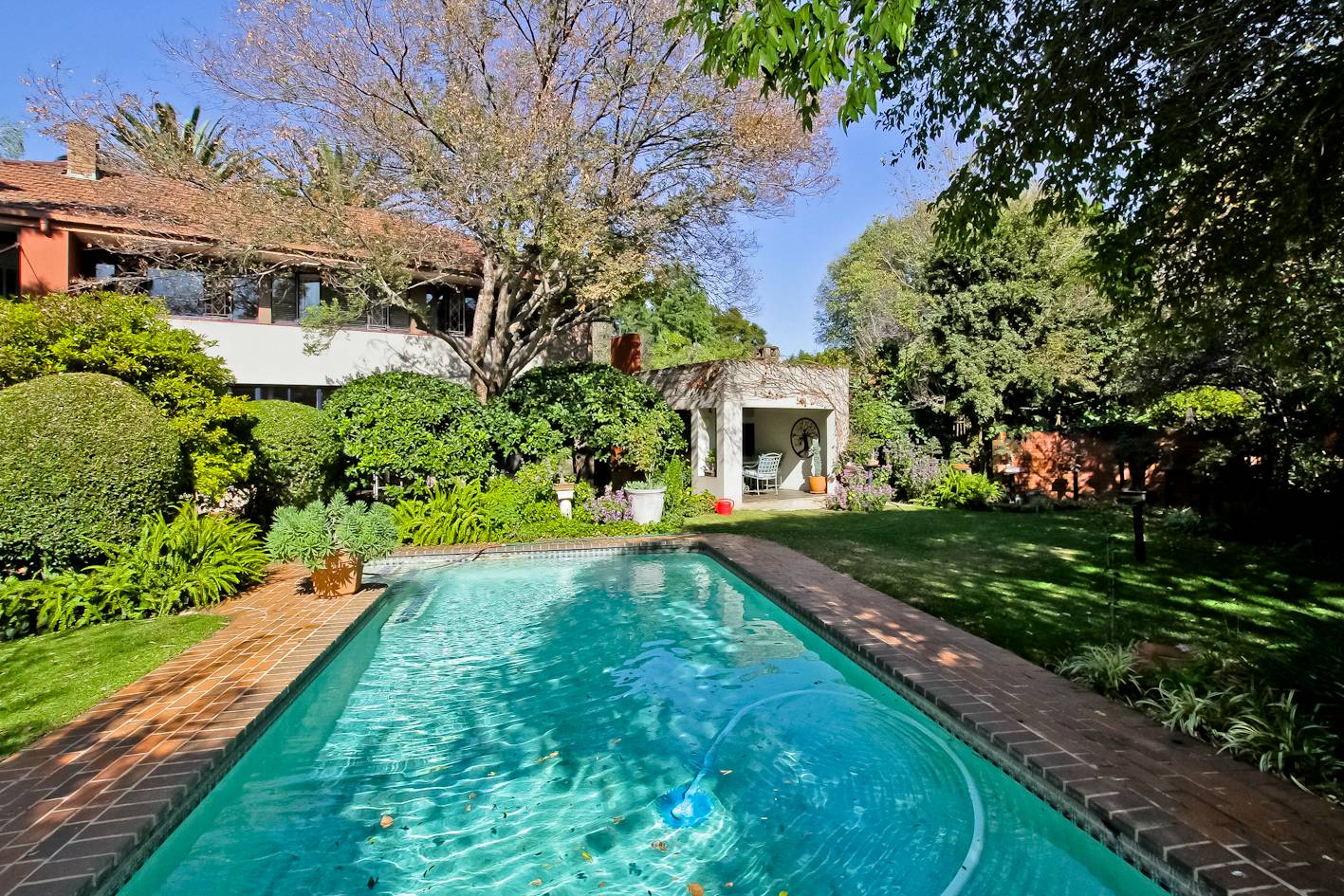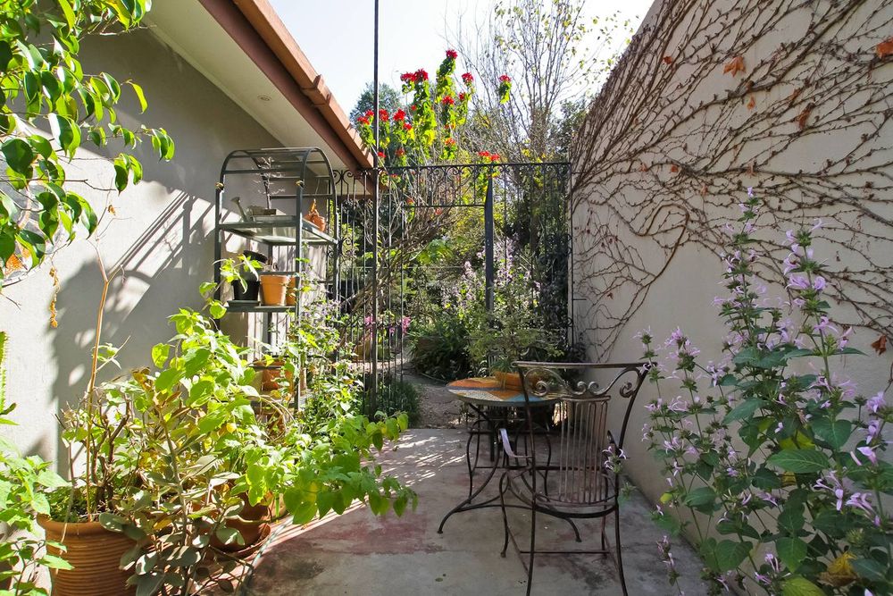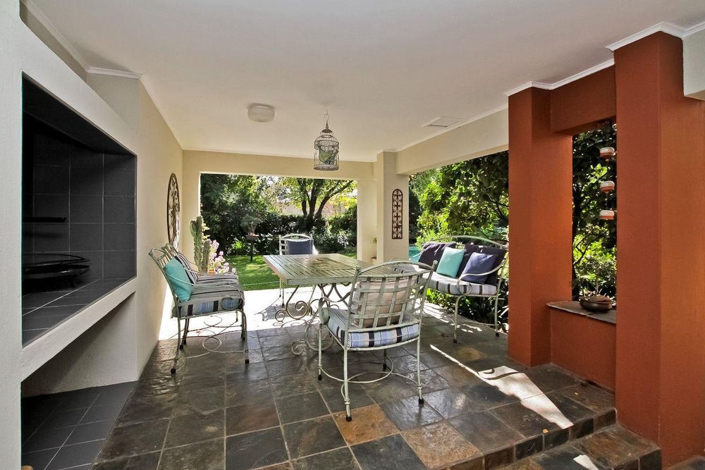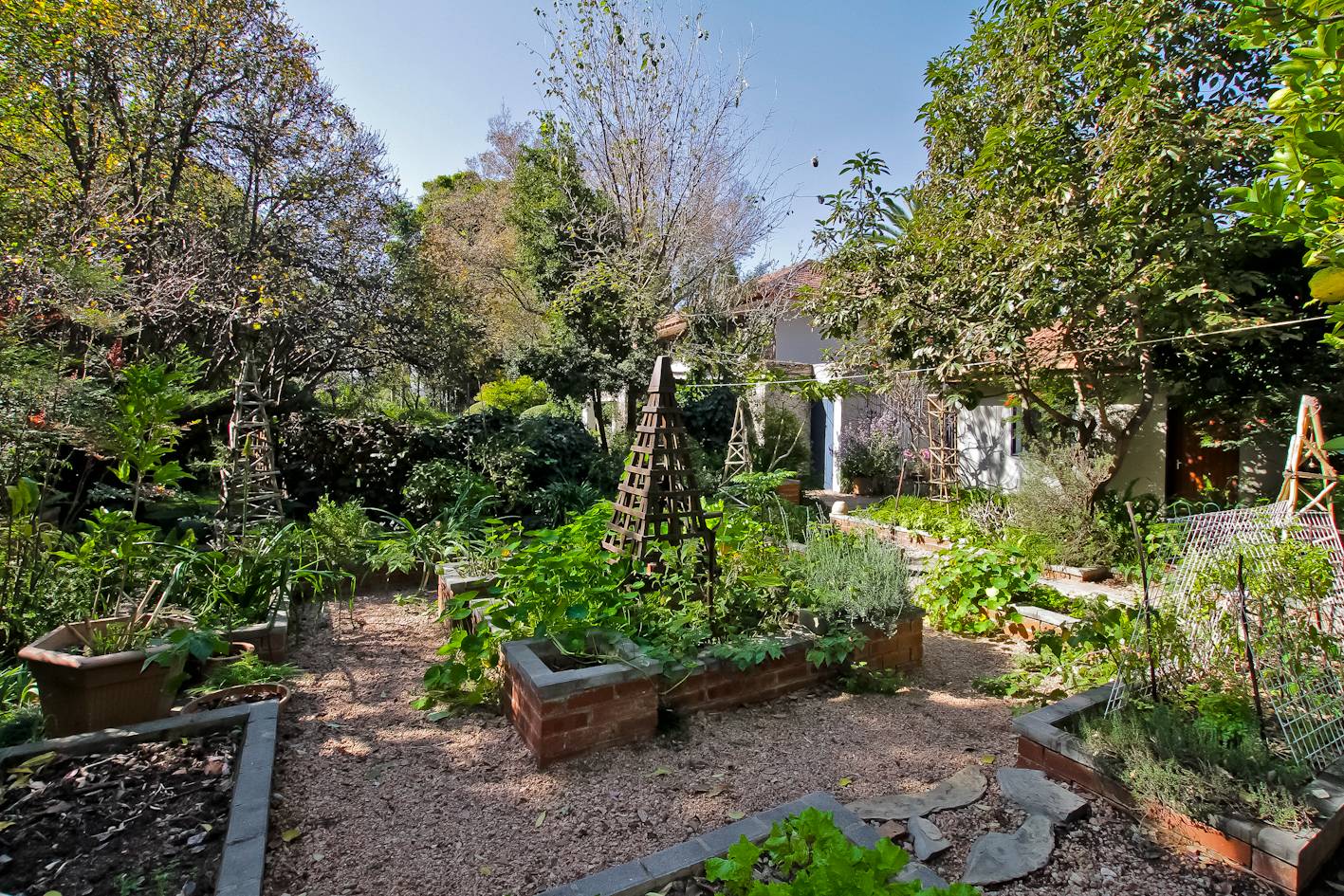 The patio leads onto generous grounds that include a swimming pool, lush manicured garden and vegetable potager.