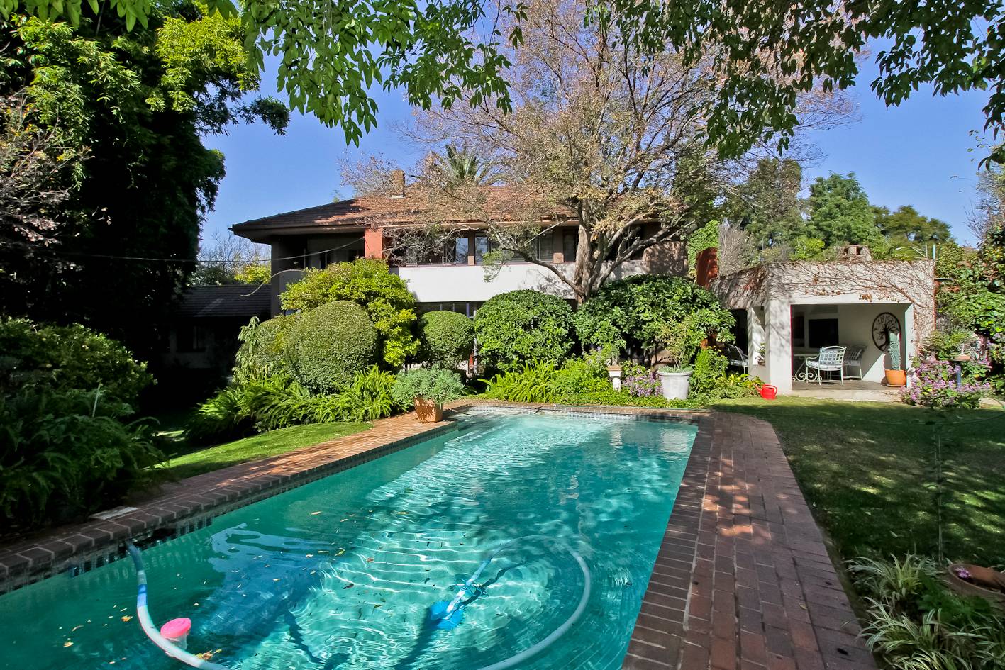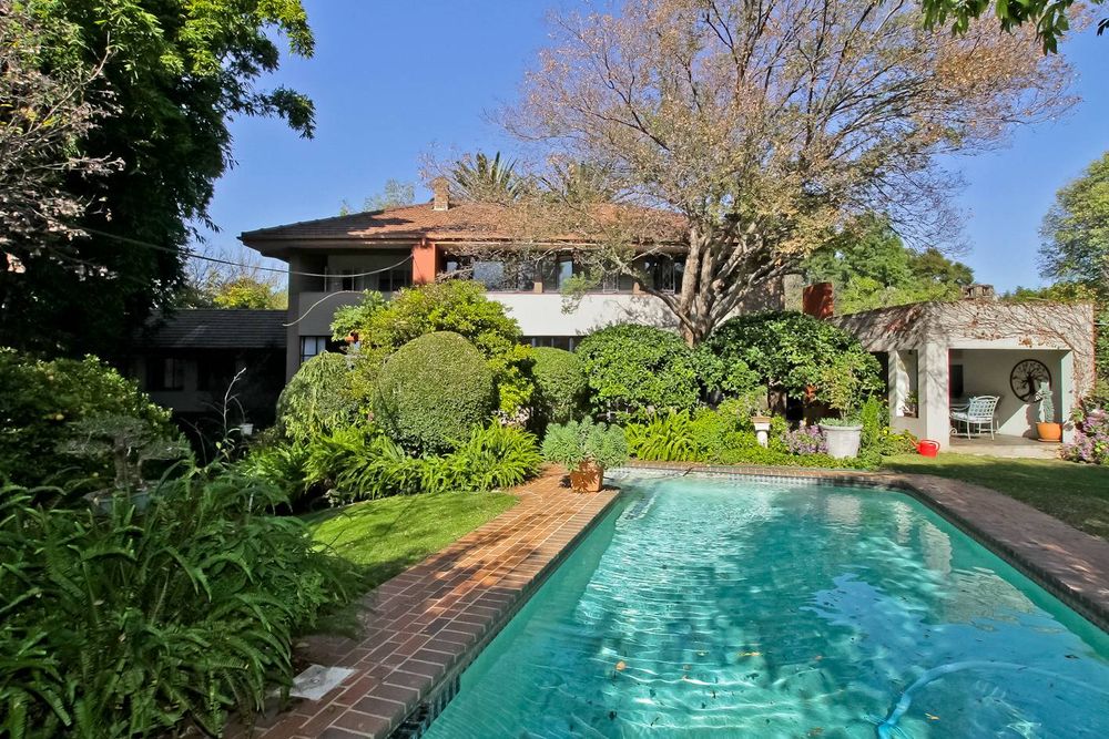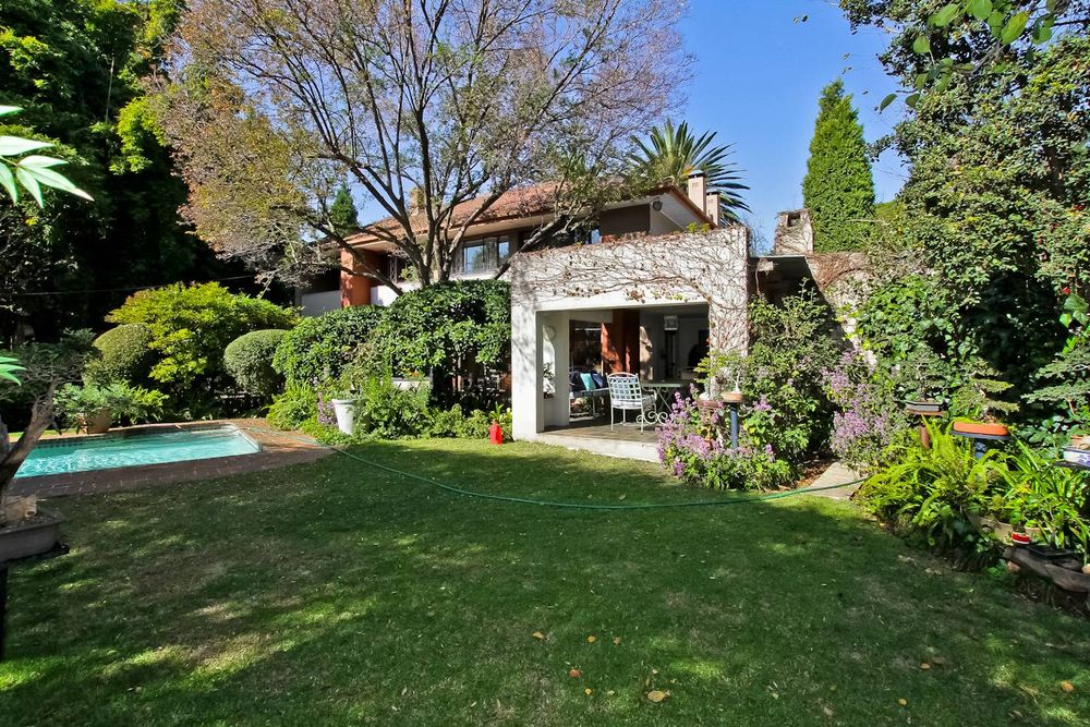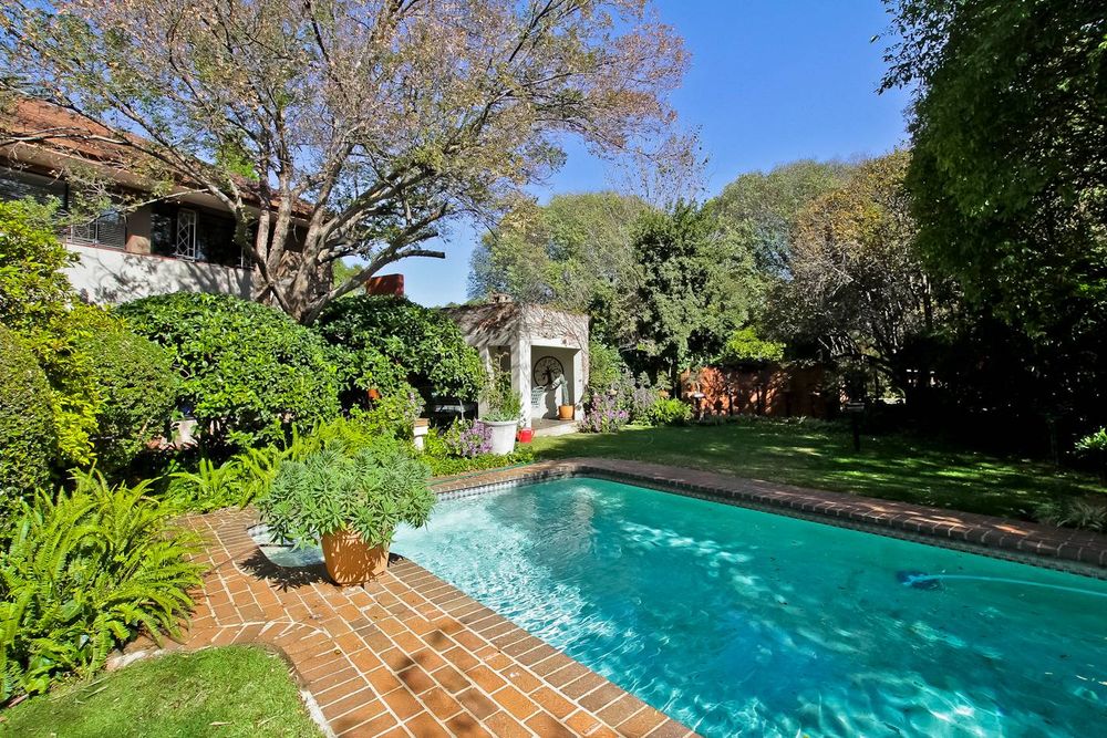 The patio leads onto generous grounds that include a swimming pool, lush manicured garden and vegetable potager.